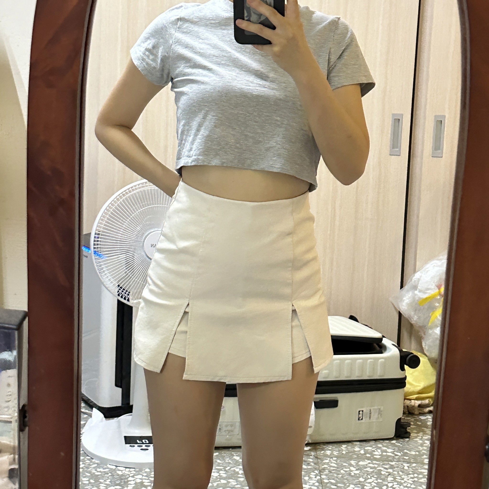 高腰設計,很適合當女團表演服,也很適合日常穿搭~雙開岔很修飾大腿肉,褲子部分和裙子是一樣材質,不用擔心曝光!