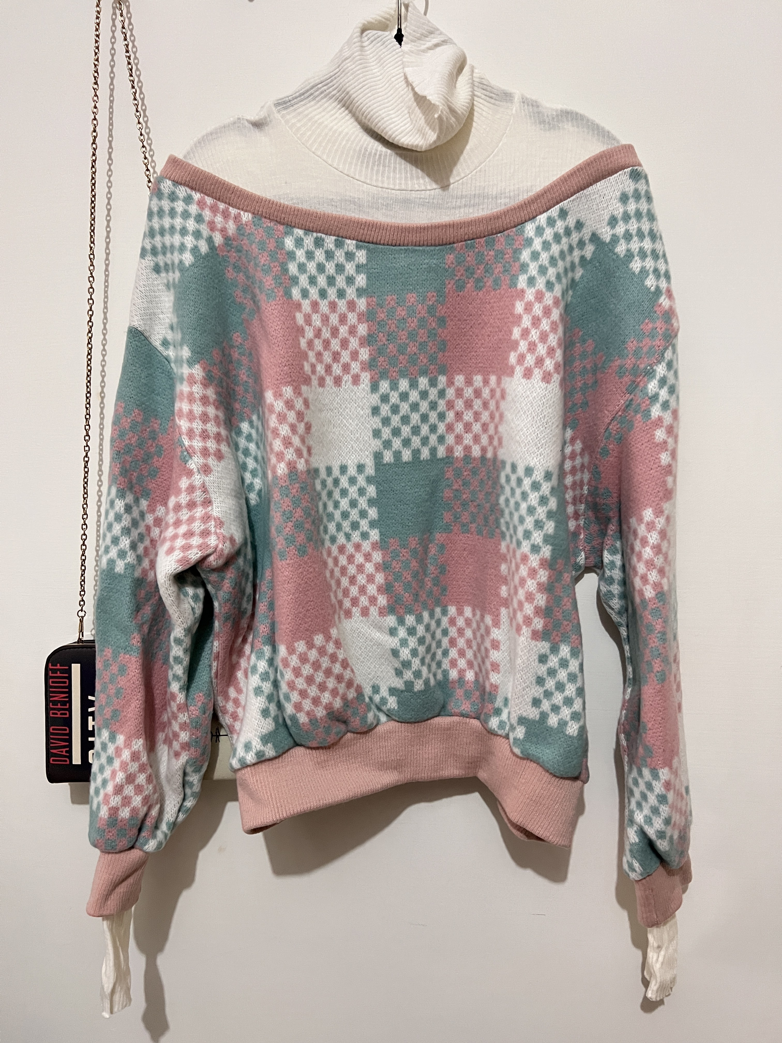 韓製高領格紋針織上衣